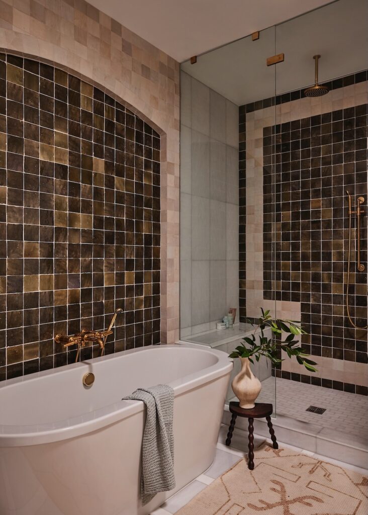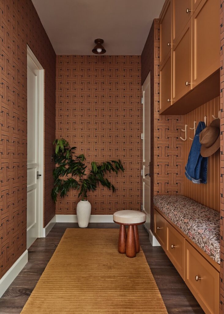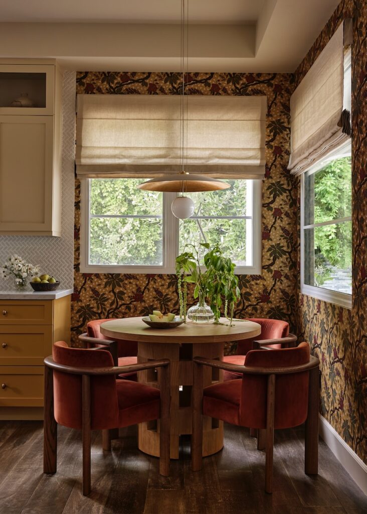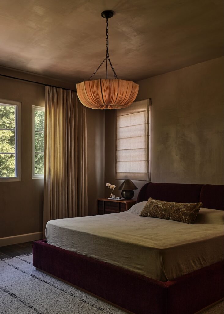 Throughout the home, a cohesive color story connects each room. The sitting room’s mauve and burgundy hues flow naturally into the gold-accented dining room, while the deep mustard kitchen provides a rich yet refreshing contrast. This harmony continues in more private spaces—floating stone sinks, custom walnut vanities, and linen window treatments soften the geometry and add tactile warmth. “Though each space carries its own distinct palette, grounding them in earthy tones creates a natural cohesion that extends throughout the home—even into rooms that aren’t directly connected,” she proclaims.
