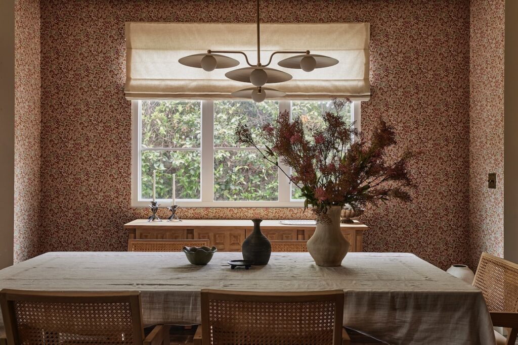 For this new build located in the hills of L.A., their goal was to bring warmth and soul to a home that initially lacked character. The clients had already been living in the space for several years before enlisting her firm to reimagine it. Their approach centered on transformation through texture, tone and materiality—introducing Roman clay walls, mohair and velvet upholstery, and playful yet timeless wallpaper to create a rich, layered aesthetic. “They wanted a layered look that blended character with cohesion, so we incorporated vintage elements—like the curved sofa in the sitting room—to add history and softness,” she recalls. “These touches helped balance the home’s clean lines with a sense of personality, giving each space a unique yet connected point of view.”